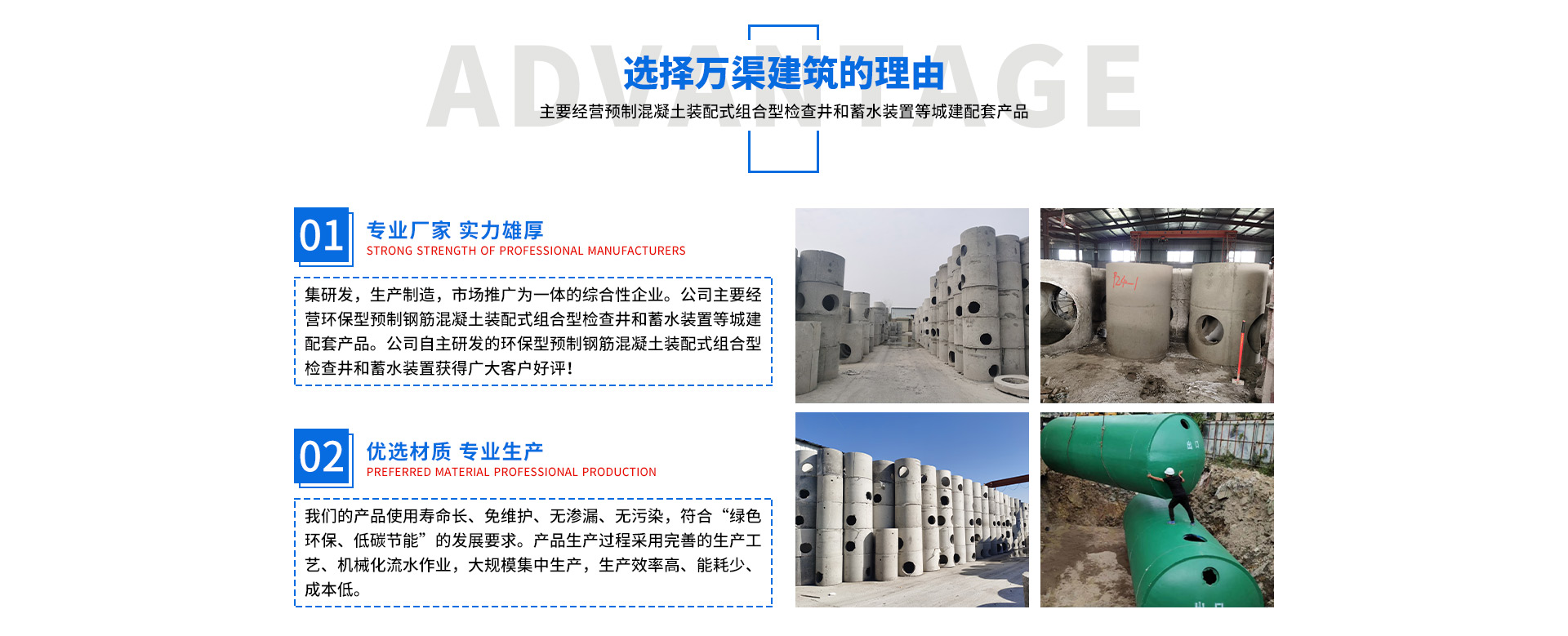 安徽萬(wàn)渠建筑科技有限公司是集研發(fā),生產(chǎn)制造,市場(chǎng)推廣為一體的綜合性企業(yè)。公司主要經(jīng)營(yíng)環(huán)保型預(yù)制鋼筋混凝土裝配式組合型檢查井和蓄水裝置等城建配套產(chǎn)品。產(chǎn)品生產(chǎn)過(guò)程采用獨(dú)特的生產(chǎn)工藝,機(jī)械化流水作業(yè)。產(chǎn)品大規(guī)模生產(chǎn),生產(chǎn)效率高,耗能少,成本低,產(chǎn)品使用壽命長(zhǎng)、免維護(hù)、無(wú)滲漏、無(wú)污染,符合“綠色環(huán)保,低碳節(jié)能”的發(fā)展要求,是傳統(tǒng)磚砌井池的理想替代產(chǎn)品。